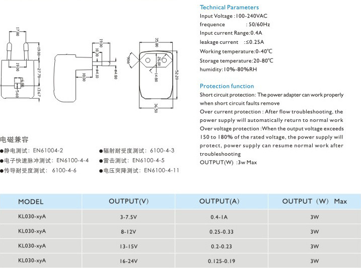 短路保護: 電源適配器在短路解除時能正常工作恢復